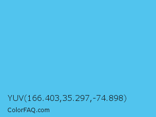 YUV 166.403,35.297,-74.898 Color is a light blue color and the nearest color is Picton Blue #45b1e8. Hex code #51c4ee and RGB value is rgb(81,196,238). In RGB color space, this color is composed of 32% red, 77% green, 93% blue, In CMYK color space, this color is composed of 66% cyan, 18% magenta, 0% yellow , 7% black , In HSL color space, this color has a hue angle of 196° , 82% saturation and 63% lightness.