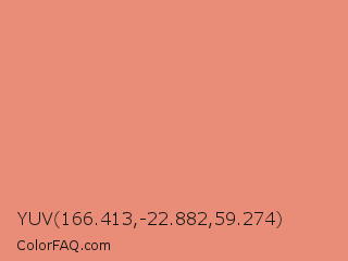 YUV 166.413,-22.882,59.274 Color is a light red color and the nearest color is Middle Red #e58e73. Hex code #ea8d78 and RGB value is rgb(234,141,120). In RGB color space, this color is composed of 92% red, 55% green, 47% blue, In CMYK color space, this color is composed of 0% cyan, 40% magenta, 49% yellow , 8% black , In HSL color space, this color has a hue angle of 11° , 73% saturation and 69% lightness.