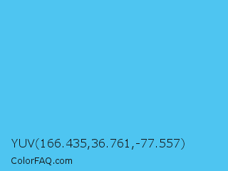 YUV 166.435,36.761,-77.557 Color is a light blue color and the nearest color is Picton Blue #45b1e8. Hex code #4ec5f1 and RGB value is rgb(78,197,241). In RGB color space, this color is composed of 31% red, 77% green, 95% blue, In CMYK color space, this color is composed of 68% cyan, 18% magenta, 0% yellow , 5% black , In HSL color space, this color has a hue angle of 196° , 85% saturation and 63% lightness.