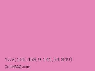 YUV 166.458,9.141,54.849 Color is a light magenta color and the nearest color is Middle Purple #d982b5. Hex code #e583b9 and RGB value is rgb(229,131,185). In RGB color space, this color is composed of 90% red, 51% green, 73% blue, In CMYK color space, this color is composed of 0% cyan, 43% magenta, 19% yellow , 10% black , In HSL color space, this color has a hue angle of 327° , 65% saturation and 71% lightness.