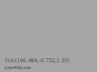 YUV 166.484,-0.732,1.33 Color is a light orange color and the nearest color is Quick Silver #a6a6a6. Hex code #a8a6a5 and RGB value is rgb(168,166,165). In RGB color space, this color is composed of 66% red, 65% green, 65% blue, In CMYK color space, this color is composed of 0% cyan, 1% magenta, 2% yellow , 34% black , In HSL color space, this color has a hue angle of 20° , 2% saturation and 65% lightness.