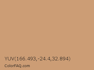 YUV 166.493,-24.4,32.894 Color is a light orange color and the nearest color is Antique Brass #cd9575. Hex code #cc9d75 and RGB value is rgb(204,157,117). In RGB color space, this color is composed of 80% red, 62% green, 46% blue, In CMYK color space, this color is composed of 0% cyan, 23% magenta, 43% yellow , 20% black , In HSL color space, this color has a hue angle of 28° , 46% saturation and 63% lightness.