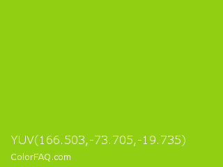 YUV 166.503,-73.705,-19.735 Color is a normal green color and the nearest color is Sheen Green #8fd400. Hex code #90cf11 and RGB value is rgb(144,207,17). In RGB color space, this color is composed of 56% red, 81% green, 7% blue, In CMYK color space, this color is composed of 30% cyan, 0% magenta, 92% yellow , 19% black , In HSL color space, this color has a hue angle of 80° , 85% saturation and 44% lightness.
