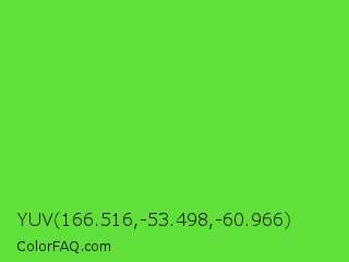 YUV 166.516,-53.498,-60.966 Color is a normal green color and the nearest color is Kiwi #8ee53f. Hex code #61df3a and RGB value is rgb(97,223,58). In RGB color space, this color is composed of 38% red, 87% green, 23% blue, In CMYK color space, this color is composed of 57% cyan, 0% magenta, 74% yellow , 13% black , In HSL color space, this color has a hue angle of 106° , 72% saturation and 55% lightness.
