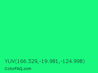 YUV 166.529,-19.981,-124.998 Color is a normal green color and the nearest color is Spring Green #00ff7f. Hex code #18f77e and RGB value is rgb(24,247,126). In RGB color space, this color is composed of 9% red, 97% green, 49% blue, In CMYK color space, this color is composed of 90% cyan, 0% magenta, 49% yellow , 3% black , In HSL color space, this color has a hue angle of 147° , 93% saturation and 53% lightness.