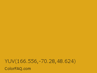 YUV 166.556,-70.28,48.624 Color is a normal orange color and the nearest color is Golden Grass #daa520. Hex code #dea618 and RGB value is rgb(222,166,24). In RGB color space, this color is composed of 87% red, 65% green, 9% blue, In CMYK color space, this color is composed of 0% cyan, 25% magenta, 89% yellow , 13% black , In HSL color space, this color has a hue angle of 43° , 80% saturation and 48% lightness.