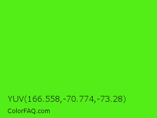 YUV 166.558,-70.774,-73.28 Color is a normal green color and the nearest color is Chlorophyll Green #4aff00. Hex code #53ed17 and RGB value is rgb(83,237,23). In RGB color space, this color is composed of 33% red, 93% green, 9% blue, In CMYK color space, this color is composed of 65% cyan, 0% magenta, 90% yellow , 7% black , In HSL color space, this color has a hue angle of 103° , 86% saturation and 51% lightness.