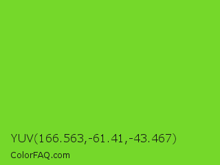 YUV 166.563,-61.41,-43.467 Color is a normal green color and the nearest color is Lima #76bd17. Hex code #75d82a and RGB value is rgb(117,216,42). In RGB color space, this color is composed of 46% red, 85% green, 16% blue, In CMYK color space, this color is composed of 46% cyan, 0% magenta, 81% yellow , 15% black , In HSL color space, this color has a hue angle of 94° , 69% saturation and 51% lightness.