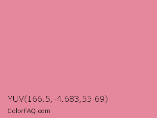 YUV 166.5,-4.683,55.69 Color is a light red color and the nearest color is Ruddy Pink #e18e96. Hex code #e6889d and RGB value is rgb(230,136,157). In RGB color space, this color is composed of 90% red, 53% green, 62% blue, In CMYK color space, this color is composed of 0% cyan, 41% magenta, 32% yellow , 10% black , In HSL color space, this color has a hue angle of 347° , 65% saturation and 72% lightness.