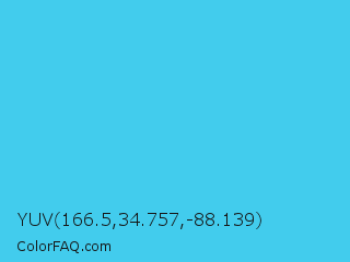 YUV 166.5,34.757,-88.139 Color is a normal cyan color and the nearest color is Picton Blue #45b1e8. Hex code #42cced and RGB value is rgb(66,204,237). In RGB color space, this color is composed of 26% red, 80% green, 93% blue, In CMYK color space, this color is composed of 72% cyan, 14% magenta, 0% yellow , 7% black , In HSL color space, this color has a hue angle of 192° , 83% saturation and 59% lightness.