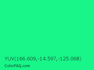 YUV 166.609,-14.597,-125.068 Color is a normal green color and the nearest color is Spring Green #00ff7f. Hex code #18f589 and RGB value is rgb(24,245,137). In RGB color space, this color is composed of 9% red, 96% green, 54% blue, In CMYK color space, this color is composed of 90% cyan, 0% magenta, 44% yellow , 4% black , In HSL color space, this color has a hue angle of 151° , 92% saturation and 53% lightness.