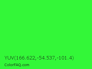YUV 166.622,-54.537,-101.4 Color is a normal green color and the nearest color is Neon Green #39ff14. Hex code #33f738 and RGB value is rgb(51,247,56). In RGB color space, this color is composed of 20% red, 97% green, 22% blue, In CMYK color space, this color is composed of 79% cyan, 0% magenta, 77% yellow , 3% black , In HSL color space, this color has a hue angle of 122° , 92% saturation and 58% lightness.