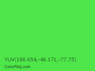 YUV 166.654,-46.171,-77.75 Color is a normal green color and the nearest color is Lime Green #32cd32. Hex code #4ee649 and RGB value is rgb(78,230,73). In RGB color space, this color is composed of 31% red, 90% green, 29% blue, In CMYK color space, this color is composed of 66% cyan, 0% magenta, 68% yellow , 10% black , In HSL color space, this color has a hue angle of 118° , 76% saturation and 59% lightness.