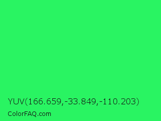 YUV 166.659,-33.849,-110.203 Color is a normal green color and the nearest color is UFO Green #3cd070. Hex code #29f462 and RGB value is rgb(41,244,98). In RGB color space, this color is composed of 16% red, 96% green, 38% blue, In CMYK color space, this color is composed of 83% cyan, 0% magenta, 60% yellow , 4% black , In HSL color space, this color has a hue angle of 137° , 90% saturation and 56% lightness.