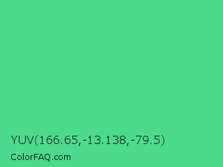 YUV 166.65,-13.138,-79.5 Color is a normal green color and the nearest color is Emerald #50c878. Hex code #4cda8c and RGB value is rgb(76,218,140). In RGB color space, this color is composed of 30% red, 85% green, 55% blue, In CMYK color space, this color is composed of 65% cyan, 0% magenta, 36% yellow , 15% black , In HSL color space, this color has a hue angle of 147° , 66% saturation and 58% lightness.
