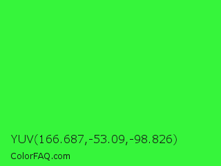 YUV 166.687,-53.09,-98.826 Color is a normal green color and the nearest color is Neon Green #39ff14. Hex code #36f53b and RGB value is rgb(54,245,59). In RGB color space, this color is composed of 21% red, 96% green, 23% blue, In CMYK color space, this color is composed of 78% cyan, 0% magenta, 76% yellow , 4% black , In HSL color space, this color has a hue angle of 122° , 91% saturation and 59% lightness.