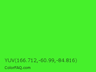 YUV 166.712,-60.99,-84.816 Color is a normal green color and the nearest color is Neon Green #39ff14. Hex code #46f02b and RGB value is rgb(70,240,43). In RGB color space, this color is composed of 27% red, 94% green, 17% blue, In CMYK color space, this color is composed of 71% cyan, 0% magenta, 82% yellow , 6% black , In HSL color space, this color has a hue angle of 112° , 87% saturation and 55% lightness.