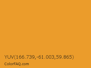 YUV 166.739,-61.003,59.865 Color is a normal orange color and the nearest color is Fire Bush #e89928. Hex code #eb9c2b and RGB value is rgb(235,156,43). In RGB color space, this color is composed of 92% red, 61% green, 17% blue, In CMYK color space, this color is composed of 0% cyan, 34% magenta, 82% yellow , 8% black , In HSL color space, this color has a hue angle of 35° , 83% saturation and 55% lightness.