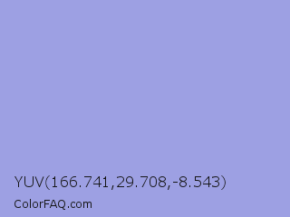 YUV 166.741,29.708,-8.543 Color is a light blue color and the nearest color is Dull Lavender #a899e6. Hex code #9da0e3 and RGB value is rgb(157,160,227). In RGB color space, this color is composed of 62% red, 63% green, 89% blue, In CMYK color space, this color is composed of 31% cyan, 30% magenta, 0% yellow , 11% black , In HSL color space, this color has a hue angle of 237° , 56% saturation and 75% lightness.