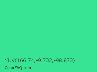 YUV 166.74,-9.732,-98.873 Color is a normal green color and the nearest color is Shamrock #33cc99. Hex code #36e493 and RGB value is rgb(54,228,147). In RGB color space, this color is composed of 21% red, 89% green, 58% blue, In CMYK color space, this color is composed of 76% cyan, 0% magenta, 36% yellow , 11% black , In HSL color space, this color has a hue angle of 152° , 76% saturation and 55% lightness.