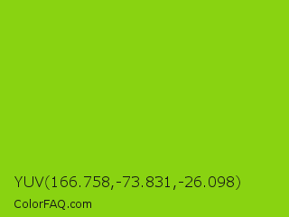 YUV 166.758,-73.831,-26.098 Color is a normal green color and the nearest color is Sheen Green #8fd400. Hex code #89d311 and RGB value is rgb(137,211,17). In RGB color space, this color is composed of 54% red, 83% green, 7% blue, In CMYK color space, this color is composed of 35% cyan, 0% magenta, 92% yellow , 17% black , In HSL color space, this color has a hue angle of 83° , 85% saturation and 45% lightness.