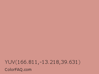 YUV 166.811,-13.218,39.631 Color is a light red color and the nearest color is My Pink #d69188. Hex code #d4958c and RGB value is rgb(212,149,140). In RGB color space, this color is composed of 83% red, 58% green, 55% blue, In CMYK color space, this color is composed of 0% cyan, 30% magenta, 34% yellow , 17% black , In HSL color space, this color has a hue angle of 8° , 46% saturation and 69% lightness.