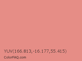 YUV 166.813,-16.177,55.415 Color is a light red color and the nearest color is Dark Salmon #e9967a. Hex code #e68d86 and RGB value is rgb(230,141,134). In RGB color space, this color is composed of 90% red, 55% green, 53% blue, In CMYK color space, this color is composed of 0% cyan, 39% magenta, 42% yellow , 10% black , In HSL color space, this color has a hue angle of 4° , 66% saturation and 71% lightness.