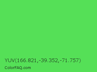 YUV 166.821,-39.352,-71.757 Color is a light green color and the nearest color is Screamin Green #66ff66. Hex code #55e057 and RGB value is rgb(85,224,87). In RGB color space, this color is composed of 33% red, 88% green, 34% blue, In CMYK color space, this color is composed of 62% cyan, 0% magenta, 61% yellow , 12% black , In HSL color space, this color has a hue angle of 121° , 69% saturation and 61% lightness.