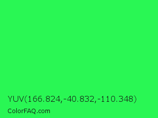 YUV 166.824,-40.832,-110.348 Color is a normal green color and the nearest color is Malachite #0bda51. Hex code #29f754 and RGB value is rgb(41,247,84). In RGB color space, this color is composed of 16% red, 97% green, 33% blue, In CMYK color space, this color is composed of 83% cyan, 0% magenta, 66% yellow , 3% black , In HSL color space, this color has a hue angle of 133° , 93% saturation and 56% lightness.