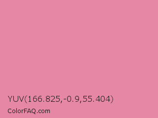YUV 166.825,-0.9,55.404 Color is a light rose color and the nearest color is Carissma #ea88a8. Hex code #e687a5 and RGB value is rgb(230,135,165). In RGB color space, this color is composed of 90% red, 53% green, 65% blue, In CMYK color space, this color is composed of 0% cyan, 41% magenta, 28% yellow , 10% black , In HSL color space, this color has a hue angle of 341° , 66% saturation and 72% lightness.