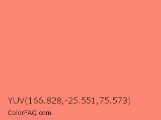 YUV 166.828,-25.551,75.573 Color is a light red color and the nearest color is Salmon #fa8072. Hex code #fd8573 and RGB value is rgb(253,133,115). In RGB color space, this color is composed of 99% red, 52% green, 45% blue, In CMYK color space, this color is composed of 0% cyan, 47% magenta, 55% yellow , 1% black , In HSL color space, this color has a hue angle of 8° , 97% saturation and 72% lightness.