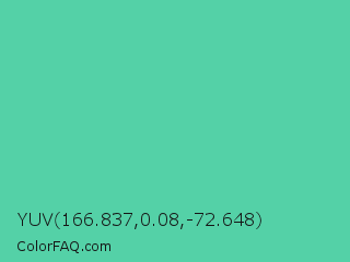 YUV 166.837,0.08,-72.648 Color is a normal green color and the nearest color is Eucalyptus #44d7a8. Hex code #54d1a7 and RGB value is rgb(84,209,167). In RGB color space, this color is composed of 33% red, 82% green, 65% blue, In CMYK color space, this color is composed of 60% cyan, 0% magenta, 20% yellow , 18% black , In HSL color space, this color has a hue angle of 160° , 58% saturation and 57% lightness.