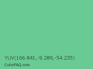 YUV 166.841,-9.289,-54.235 Color is a normal green color and the nearest color is De York #7ac488. Hex code #69ca94 and RGB value is rgb(105,202,148). In RGB color space, this color is composed of 41% red, 79% green, 58% blue, In CMYK color space, this color is composed of 48% cyan, 0% magenta, 27% yellow , 21% black , In HSL color space, this color has a hue angle of 147° , 48% saturation and 60% lightness.