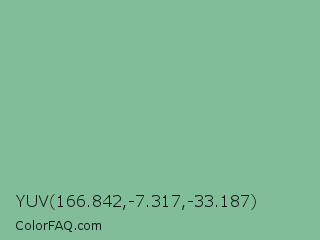 YUV 166.842,-7.317,-33.187 Color is a light green color and the nearest color is Acapulco #7cb0a1. Hex code #81bd98 and RGB value is rgb(129,189,152). In RGB color space, this color is composed of 51% red, 74% green, 60% blue, In CMYK color space, this color is composed of 32% cyan, 0% magenta, 20% yellow , 26% black , In HSL color space, this color has a hue angle of 143° , 31% saturation and 62% lightness.