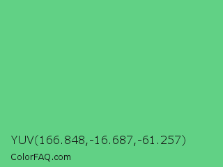 YUV 166.848,-16.687,-61.257 Color is a normal green color and the nearest color is Emerald #50c878. Hex code #61d185 and RGB value is rgb(97,209,133). In RGB color space, this color is composed of 38% red, 82% green, 52% blue, In CMYK color space, this color is composed of 54% cyan, 0% magenta, 36% yellow , 18% black , In HSL color space, this color has a hue angle of 139° , 55% saturation and 60% lightness.