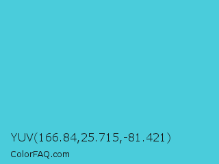 YUV 166.84,25.715,-81.421 Color is a normal cyan color and the nearest color is Sea Serpent #4bc7cf. Hex code #4accdb and RGB value is rgb(74,204,219). In RGB color space, this color is composed of 29% red, 80% green, 86% blue, In CMYK color space, this color is composed of 66% cyan, 7% magenta, 0% yellow , 14% black , In HSL color space, this color has a hue angle of 186° , 67% saturation and 57% lightness.