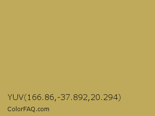 YUV 166.86,-37.892,20.294 Color is a normal yellow color and the nearest color is Husk #b7a458. Hex code #beaa5a and RGB value is rgb(190,170,90). In RGB color space, this color is composed of 75% red, 67% green, 35% blue, In CMYK color space, this color is composed of 0% cyan, 11% magenta, 53% yellow , 25% black , In HSL color space, this color has a hue angle of 48° , 43% saturation and 55% lightness.