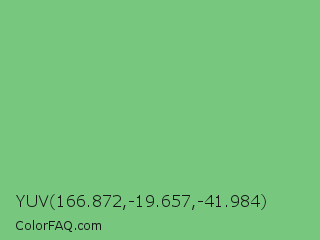 YUV 166.872,-19.657,-41.984 Color is a light green color and the nearest color is De York #7ac488. Hex code #77c77f and RGB value is rgb(119,199,127). In RGB color space, this color is composed of 47% red, 78% green, 50% blue, In CMYK color space, this color is composed of 40% cyan, 0% magenta, 36% yellow , 22% black , In HSL color space, this color has a hue angle of 126° , 42% saturation and 62% lightness.