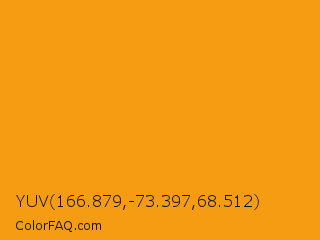 YUV 166.879,-73.397,68.512 Color is a normal orange color and the nearest color is Tree Poppy #fc9c1d. Hex code #f59c12 and RGB value is rgb(245,156,18). In RGB color space, this color is composed of 96% red, 61% green, 7% blue, In CMYK color space, this color is composed of 0% cyan, 36% magenta, 93% yellow , 4% black , In HSL color space, this color has a hue angle of 36° , 92% saturation and 52% lightness.