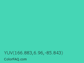 YUV 166.883,6.96,-85.843 Color is a normal cyan color and the nearest color is Eucalyptus #44d7a8. Hex code #45d6b5 and RGB value is rgb(69,214,181). In RGB color space, this color is composed of 27% red, 84% green, 71% blue, In CMYK color space, this color is composed of 68% cyan, 0% magenta, 15% yellow , 16% black , In HSL color space, this color has a hue angle of 166° , 64% saturation and 55% lightness.