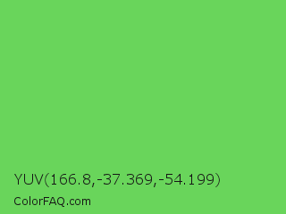YUV 166.8,-37.369,-54.199 Color is a normal green color and the nearest color is Mantis #74c365. Hex code #69d55b and RGB value is rgb(105,213,91). In RGB color space, this color is composed of 41% red, 84% green, 36% blue, In CMYK color space, this color is composed of 51% cyan, 0% magenta, 57% yellow , 16% black , In HSL color space, this color has a hue angle of 113° , 59% saturation and 60% lightness.