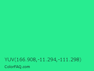 YUV 166.908,-11.294,-111.298 Color is a normal green color and the nearest color is Shamrock #33cc99. Hex code #28ec90 and RGB value is rgb(40,236,144). In RGB color space, this color is composed of 16% red, 93% green, 56% blue, In CMYK color space, this color is composed of 83% cyan, 0% magenta, 39% yellow , 7% black , In HSL color space, this color has a hue angle of 152° , 84% saturation and 54% lightness.