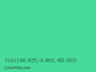 YUV 166.925,-6.865,-85.003 Color is a normal green color and the nearest color is Eucalyptus #44d7a8. Hex code #46db99 and RGB value is rgb(70,219,153). In RGB color space, this color is composed of 27% red, 86% green, 60% blue, In CMYK color space, this color is composed of 68% cyan, 0% magenta, 30% yellow , 14% black , In HSL color space, this color has a hue angle of 153° , 67% saturation and 57% lightness.