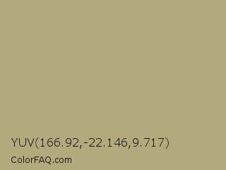 YUV 166.92,-22.146,9.717 Color is a normal yellow color and the nearest color is Mongoose #b5a27f. Hex code #b2aa7a and RGB value is rgb(178,170,122). In RGB color space, this color is composed of 70% red, 67% green, 48% blue, In CMYK color space, this color is composed of 0% cyan, 4% magenta, 31% yellow , 30% black , In HSL color space, this color has a hue angle of 51° , 27% saturation and 59% lightness.