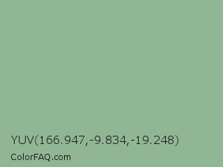 YUV 166.947,-9.834,-19.248 Color is a light green color and the nearest color is Dark Sea Green #8fbc8f. Hex code #91b693 and RGB value is rgb(145,182,147). In RGB color space, this color is composed of 57% red, 71% green, 58% blue, In CMYK color space, this color is composed of 20% cyan, 0% magenta, 19% yellow , 29% black , In HSL color space, this color has a hue angle of 123° , 20% saturation and 64% lightness.