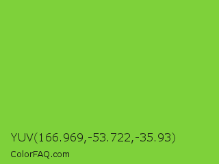 YUV 166.969,-53.722,-35.93 Color is a normal green color and the nearest color is Kiwi #8ee53f. Hex code #7ed13a and RGB value is rgb(126,209,58). In RGB color space, this color is composed of 49% red, 82% green, 23% blue, In CMYK color space, this color is composed of 40% cyan, 0% magenta, 72% yellow , 18% black , In HSL color space, this color has a hue angle of 93° , 62% saturation and 52% lightness.