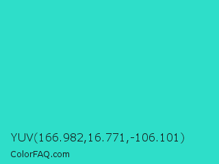 YUV 166.982,16.771,-106.101 Color is a normal cyan color and the nearest color is Turquoise PWG #30d5c8. Hex code #2edec9 and RGB value is rgb(46,222,201). In RGB color space, this color is composed of 18% red, 87% green, 79% blue, In CMYK color space, this color is composed of 79% cyan, 0% magenta, 9% yellow , 13% black , In HSL color space, this color has a hue angle of 173° , 73% saturation and 53% lightness.