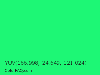 YUV 166.998,-24.649,-121.024 Color is a normal green color and the nearest color is Spring Green #00ff7f. Hex code #1df775 and RGB value is rgb(29,247,117). In RGB color space, this color is composed of 11% red, 97% green, 46% blue, In CMYK color space, this color is composed of 88% cyan, 0% magenta, 53% yellow , 3% black , In HSL color space, this color has a hue angle of 144° , 93% saturation and 54% lightness.