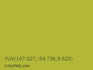 YUV 167.027,-54.736,9.623 Color is a normal yellow color and the nearest color is Brass #b5a642. Hex code #b2b738 and RGB value is rgb(178,183,56). In RGB color space, this color is composed of 70% red, 72% green, 22% blue, In CMYK color space, this color is composed of 3% cyan, 0% magenta, 69% yellow , 28% black , In HSL color space, this color has a hue angle of 62° , 53% saturation and 47% lightness.