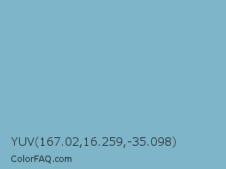 YUV 167.02,16.259,-35.098 Color is a light blue color and the nearest color is Glacier #80b3c4. Hex code #7fb5c8 and RGB value is rgb(127,181,200). In RGB color space, this color is composed of 50% red, 71% green, 78% blue, In CMYK color space, this color is composed of 37% cyan, 10% magenta, 0% yellow , 22% black , In HSL color space, this color has a hue angle of 196° , 40% saturation and 64% lightness.